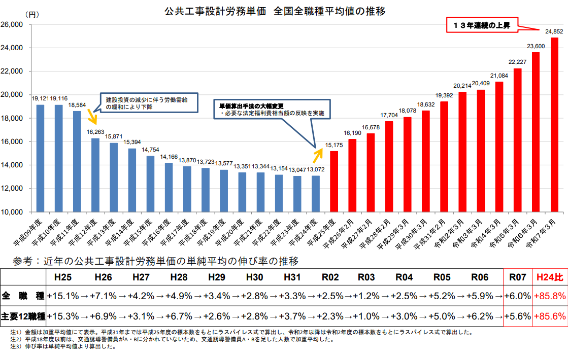 国土交通省が公表する「公共工事設計労務単価」は、2020年の全国全職種平均19,392円から2025年には24,852円へと、5年間で約28%上昇しました。