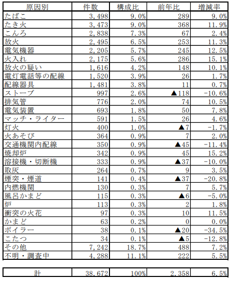火災の出火原因で最も多いのは「たばこ」の3,498件、次いで「たき火」の3,473件、「こんろ」の2,838件という順です。