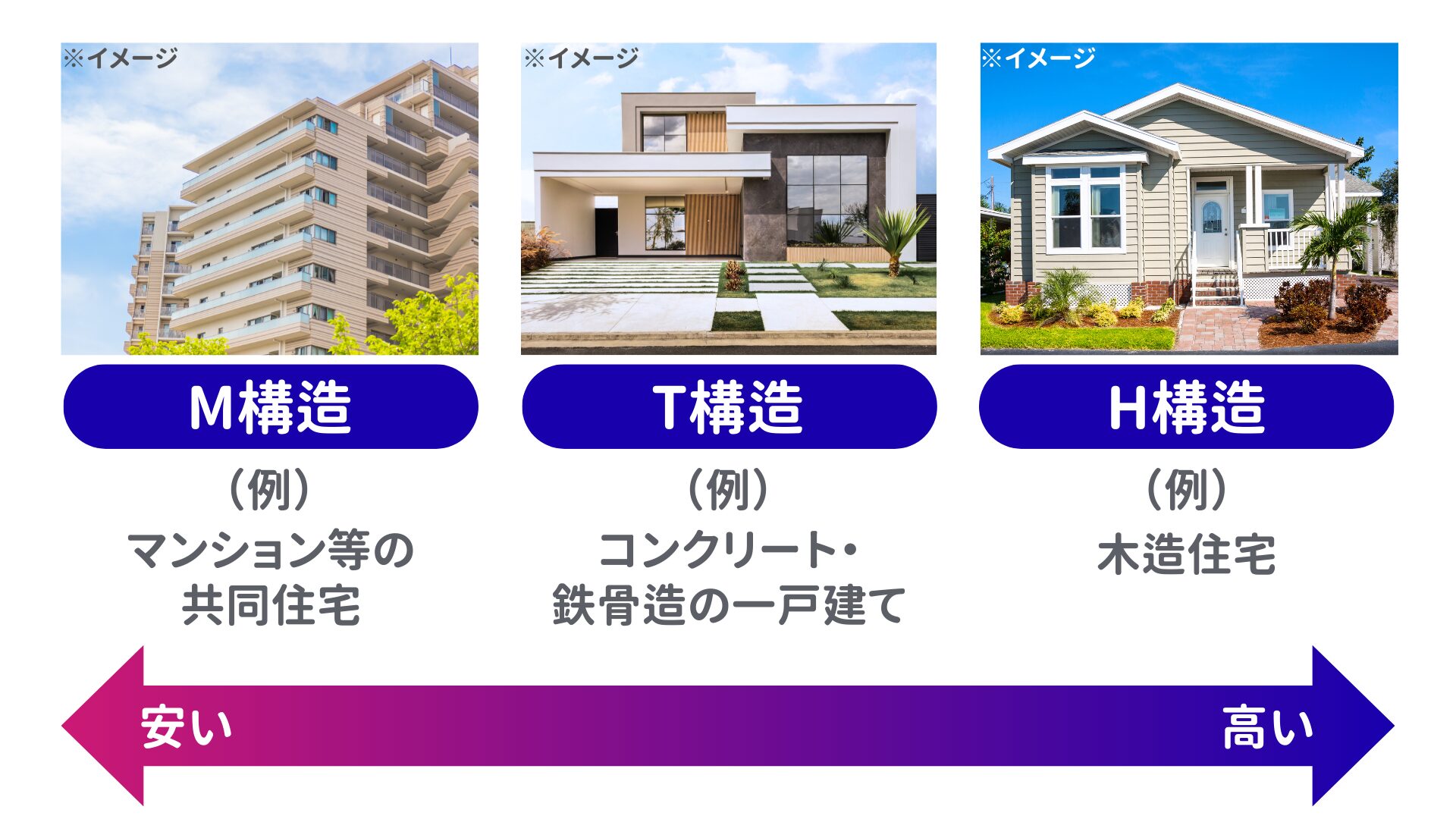 一般的に、M構造は火災に強いため保険料が最も安く、木造のH構造は保険料が最も高くなります。