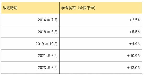 この参考純率が、2014年以降だけで5回にわたって引き上げられてきました。