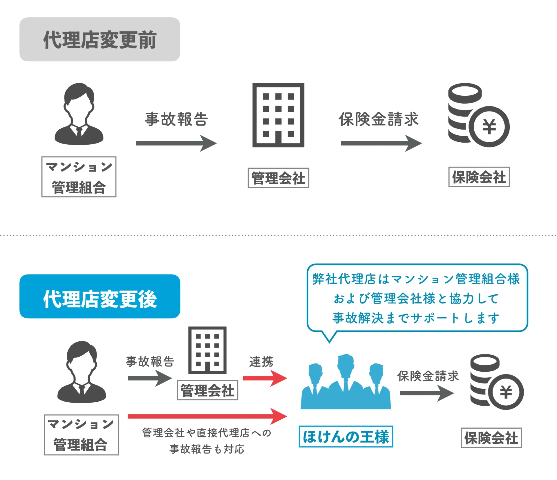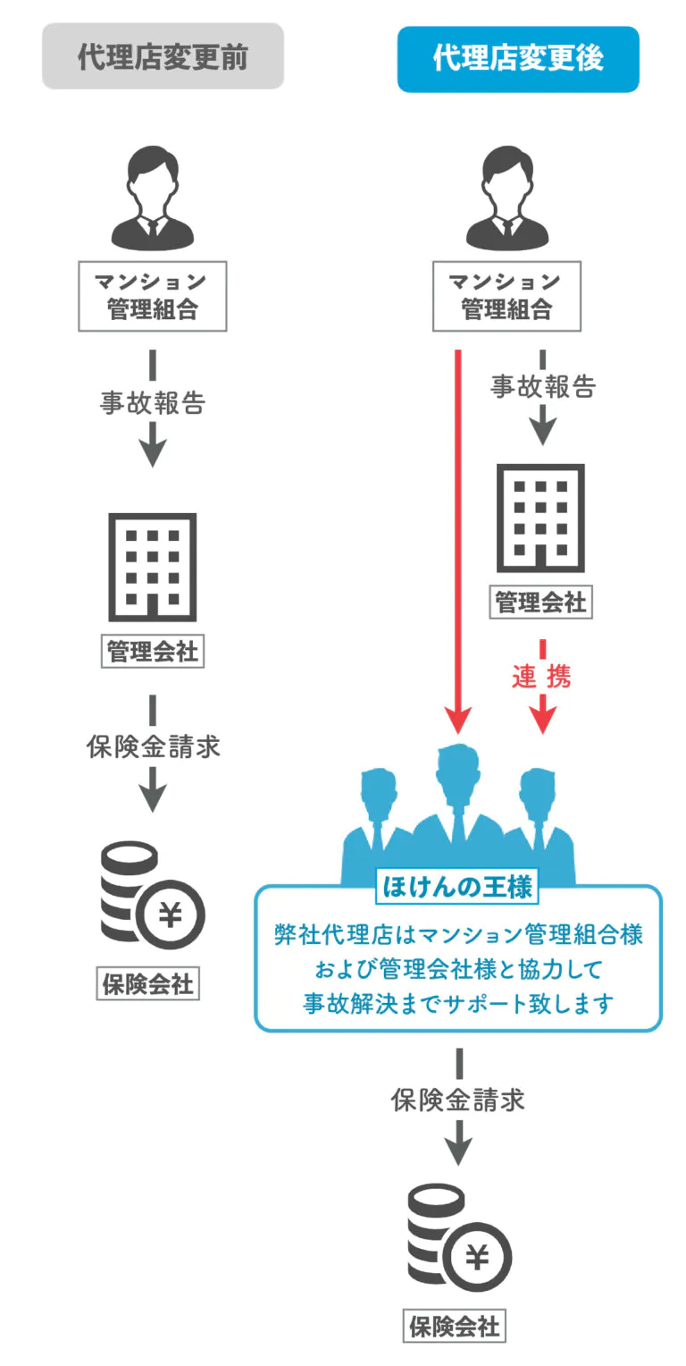 保険加入後は、管理組合さま、管理会社さまと連携しながら、保険金請求手続きを進めますので、保険代理店を変更したことでのデメリットはありません。