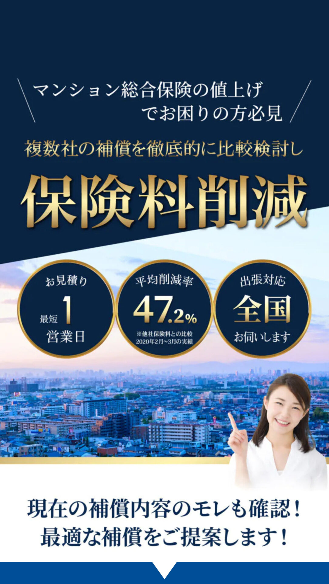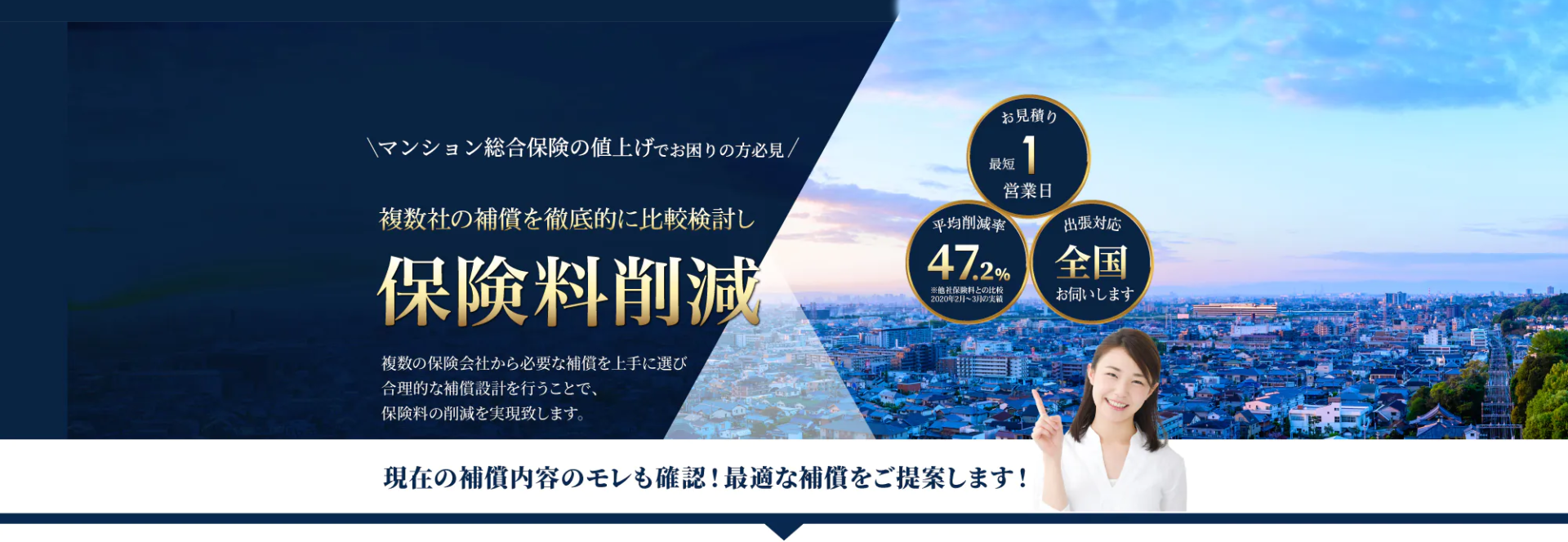 マンション管理組合で加入しているマンション総合保険が満期を迎えた際、「同じ補償内容で更新すると保険料が約2.5倍になる」と言われ、あまりにも保険料が高いので他の保険会社を探していたところ、「ほけんの王様」を見つけました。