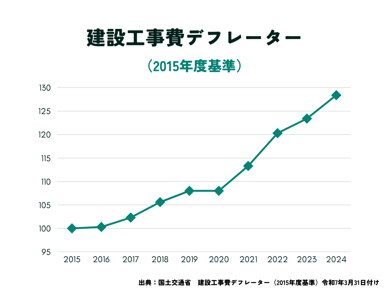 国土交通省が発表している「建設工事費デフレーター」という指数を見ると、2015年を100とした場合、2024年には120を超え、130に迫る水準にまで上昇しています。