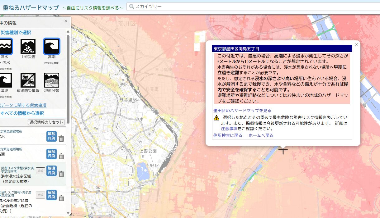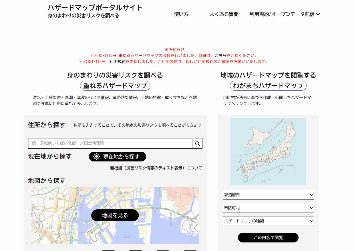 国土交通省のハザードマップポータルサイトで簡単に洪水・土砂災害・高潮・津波のリスク情報を確認することができます。